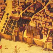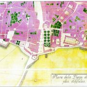 - [:es]Figura 4.- Detalle del área en la que se asentó la ciudad romana (óleo anónimo, s. XVII). Se mantienen dos torres en la muralla del mar que podrían ser permanencias de las romanas. [:ca]Figura 4.- Detall de l’àrea en la qual es va assentar la ciutat romana (oli anònim, s. XVII) . Es mantenen dues torres a la muralla del mar que podrien ser permanències de les romanes.