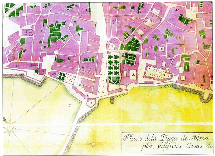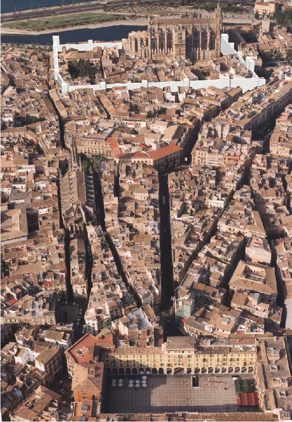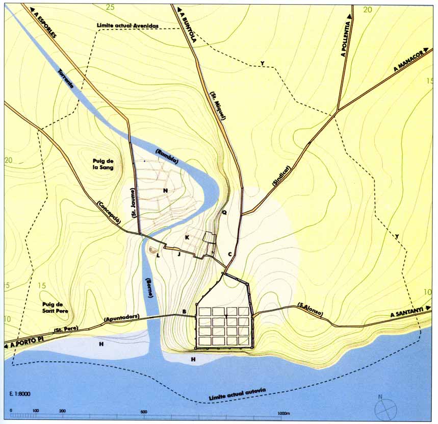 Los límites de la primitiva ciudadela pueden observarse en la figura 2. El borde oeste (K-D) de la ciudad corresponde a la alineación de la fachada principal del castillo de la Almudaina, donde todavía pueden verse las bases de varias torres que probablemente conservan las piedras originales de la muralla romana. El suelo donde mil años después se construyó la Almudaina era un talud en fuerte pendiente hacia la desembocadura del torrente y el mar. Se aprovechó la antigua muralla romana para cerrar su fachada este. Las cuatro torres originales de la fachada de la Almudaina aparecen bien definidas en el plano de Ballester de 1760 (fig. 3).
