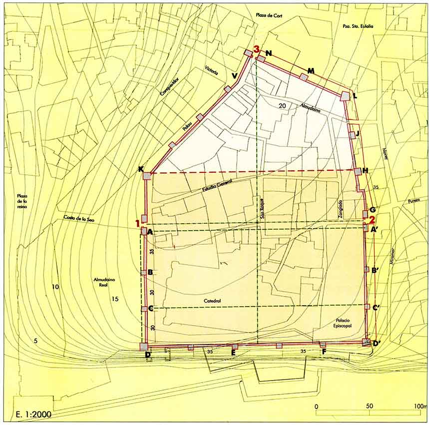Els límits de la primitiva ciutadella es poden observar a la figura 2. La vora oest (K-D) de la ciutat correspon a l’alineació de la façana principal del castell de l’Almudaina, on encara es poden veure les bases de diverses torres que probablement conserven les pedres originals de la muralla romana. El sòl on mil anys després es va construir l’Almudaina era un talús en fort pendent cap a la desembocadura del torrent i el mar. Es va aprofitar l’antiga muralla romana per tancar la seva façana Est. Les quatre torres originals de la façana de l’Almudaina apareixen ben definides en el pla de Ballester de 1760 (fig. 3).