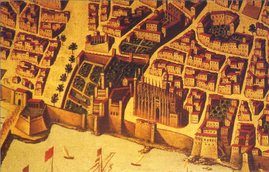 - [:es]Figura 4.- Detalle del área en la que se asentó la ciudad romana (óleo anónimo, s. XVII). Se mantienen dos torres en la muralla del mar que podrían ser permanencias de las romanas. [:ca]Figura 4.- Detall de l’àrea en la qual es va assentar la ciutat romana (oli anònim, s. XVII) . Es mantenen dues torres a la muralla del mar que podrien ser permanències de les romanes.