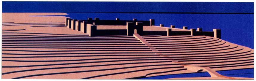 - [:es]Figura 5.- Vista hipotética del recinto amurallado del primer campamento romano de Palma. (Autor C.G.Delgado) [:ca]Figura 5.- Vista hipotètica del recinte emmurallat del primer campament romà de Palma. (Autor C.G.Delgado)